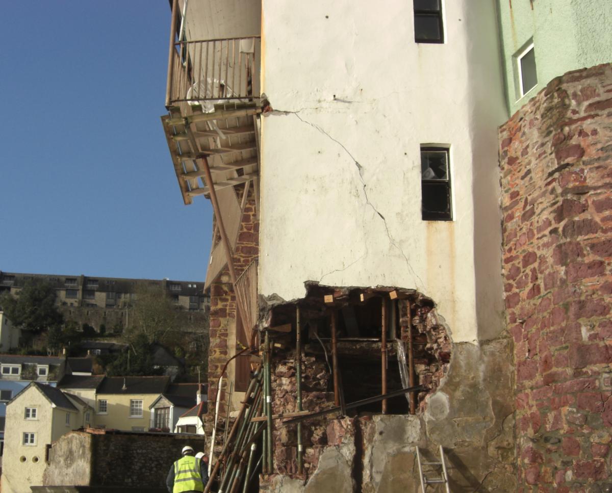 JGP were commissioned on the 7th February to engineer the emergency works to stabilise the building. Over the weekend of the 8th and 9th February, Celtic Construction worked in very difficult conditions to install props to remove the risk of immediate collapse. And with further storms imminent, cement/sand mortar was temporarily hand-packed into the damaged south-east quoin masonry.