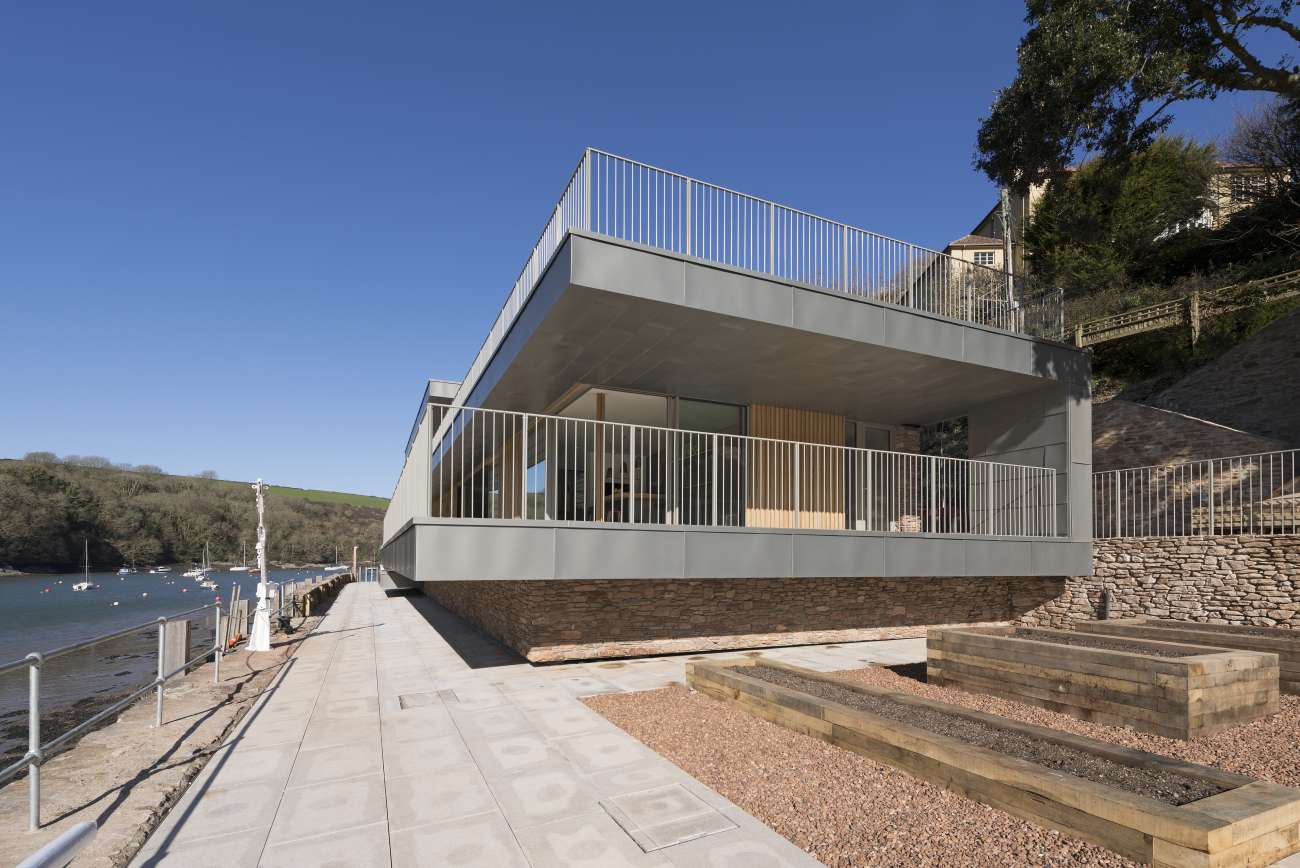 The two-storey building is formed using a braced steel frame with concrete floors. Extensive glazed facades and covered external spaces were formed by cantilevered structures. The largest of which is a 3.5m cantilevered external first floor terrace providing breath taking views across the river. Zinc-clad highly insulted walls (formed using solid timber stud within the steel frame), sit neatly alongside sliding external specialist-crafted oak privacy screens.