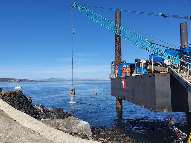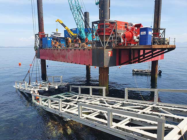 The slipway structure, measuring 40m in length and 6m in width, is formed from a braced steel deck supported by a series of portalised frames. This structure rests on piles set into the varying-level rock platforms which descend within the intertidal zone to approximately 0.5m below the Lowest Astronomical Tide. A drilling methodology was devised by JGP that utilised an Odex Rig, supported on a bespoke platform that extended from a Jack-up Barge. The pile design takes into account future erosion of the wave-cut rock platform, incorporating tolerances and functionality for the piles to serve as columns should the surrounding rock mass be lost.
